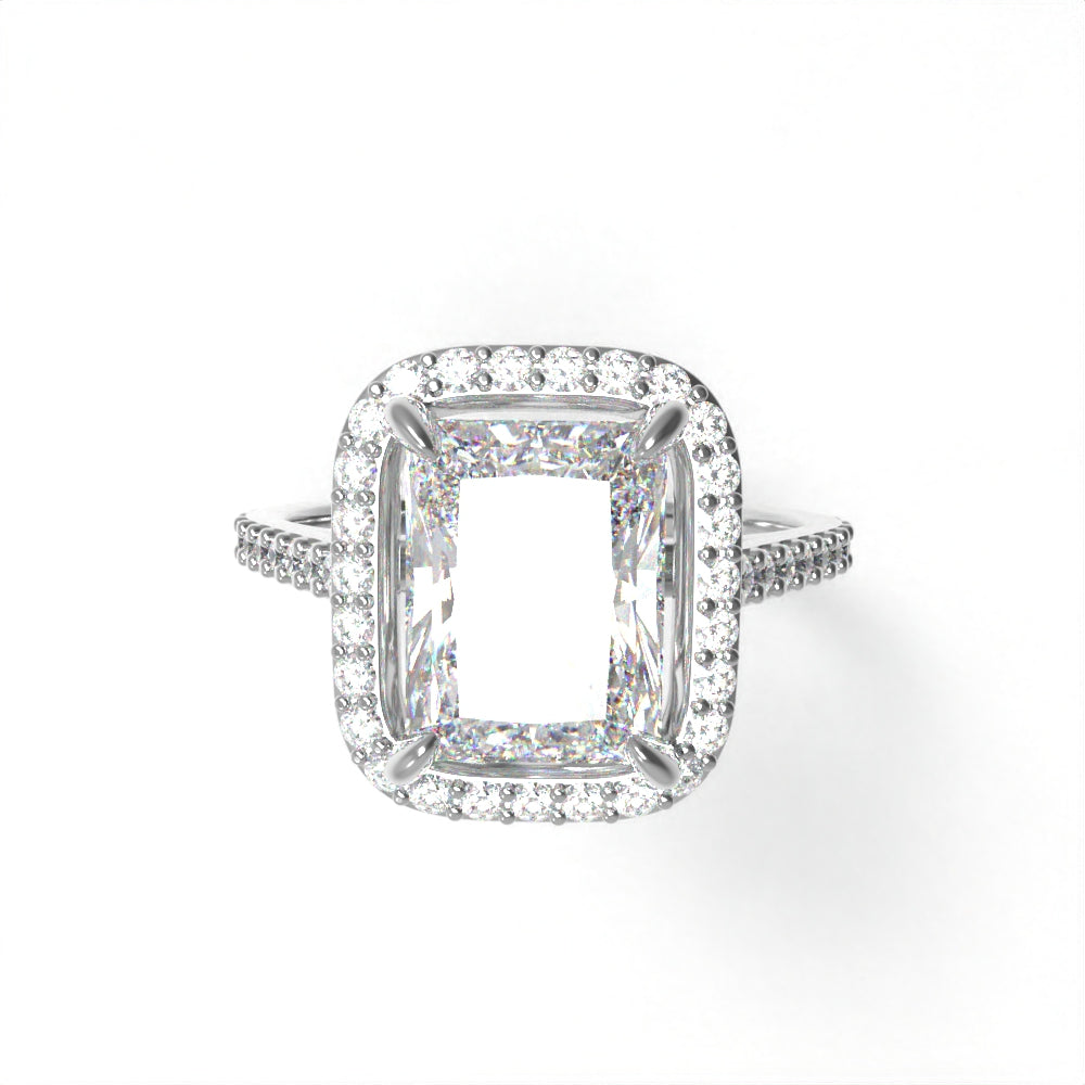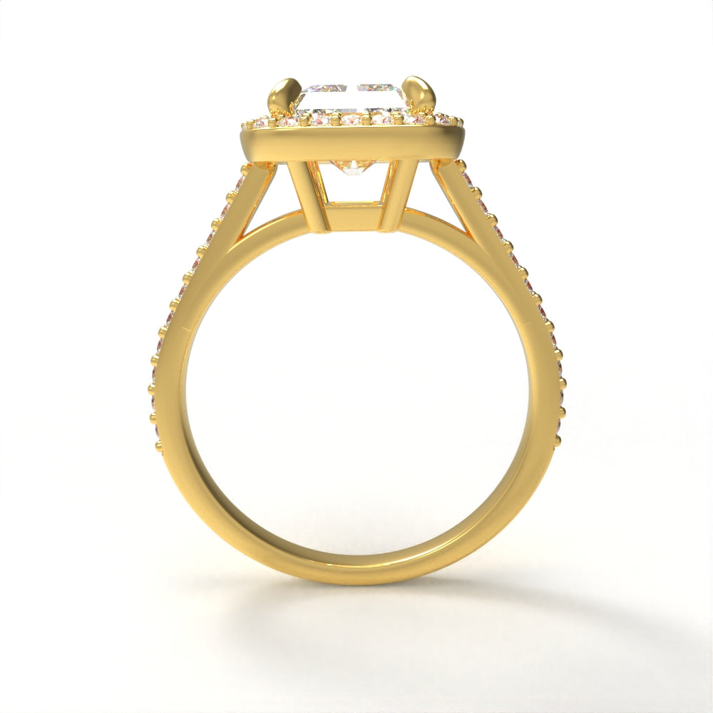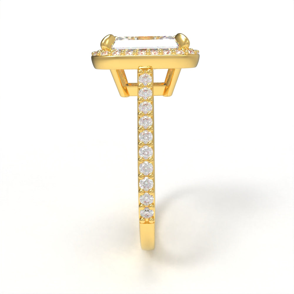 A bold halo engagement ring featuring a cushion-cut center stone surrounded by a dazzling halo and a pavé-set band. Designed in 14K or 18K gold, this ring radiates brilliance from every angle.