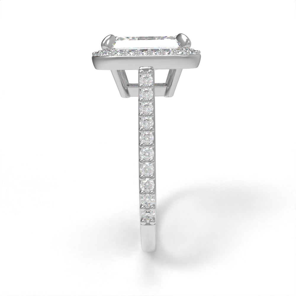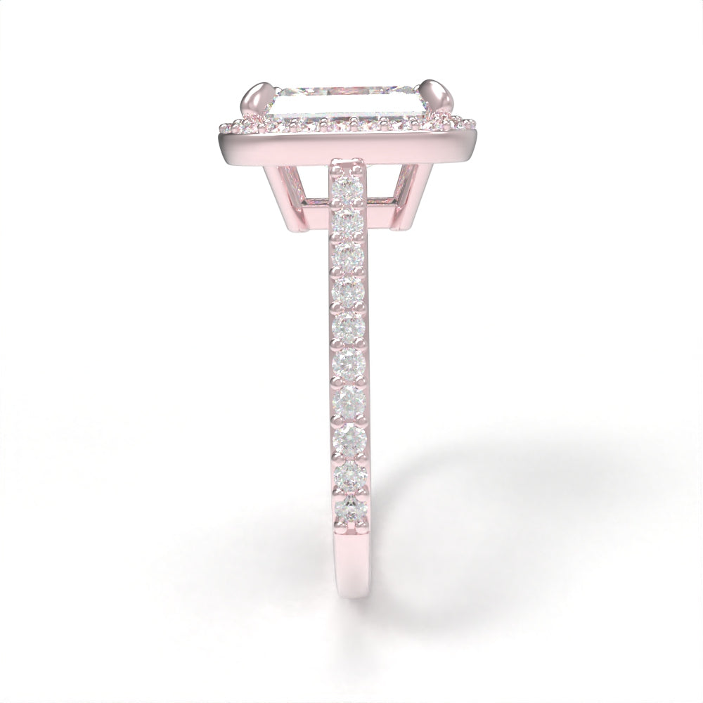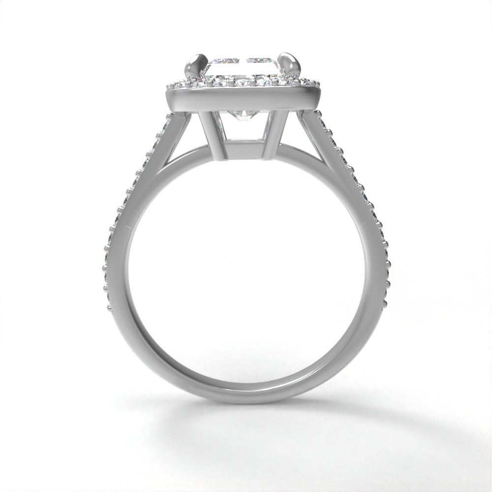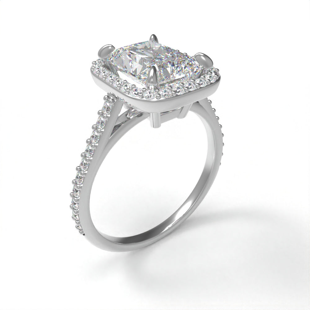A bold halo engagement ring featuring a cushion-cut center stone surrounded by a dazzling halo and a pavé-set band. Designed in 14K or 18K gold, this ring radiates brilliance from every angle.