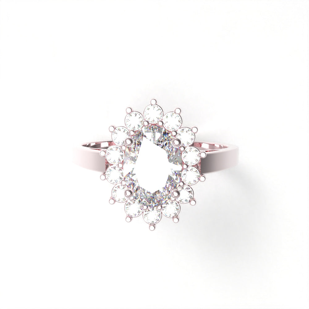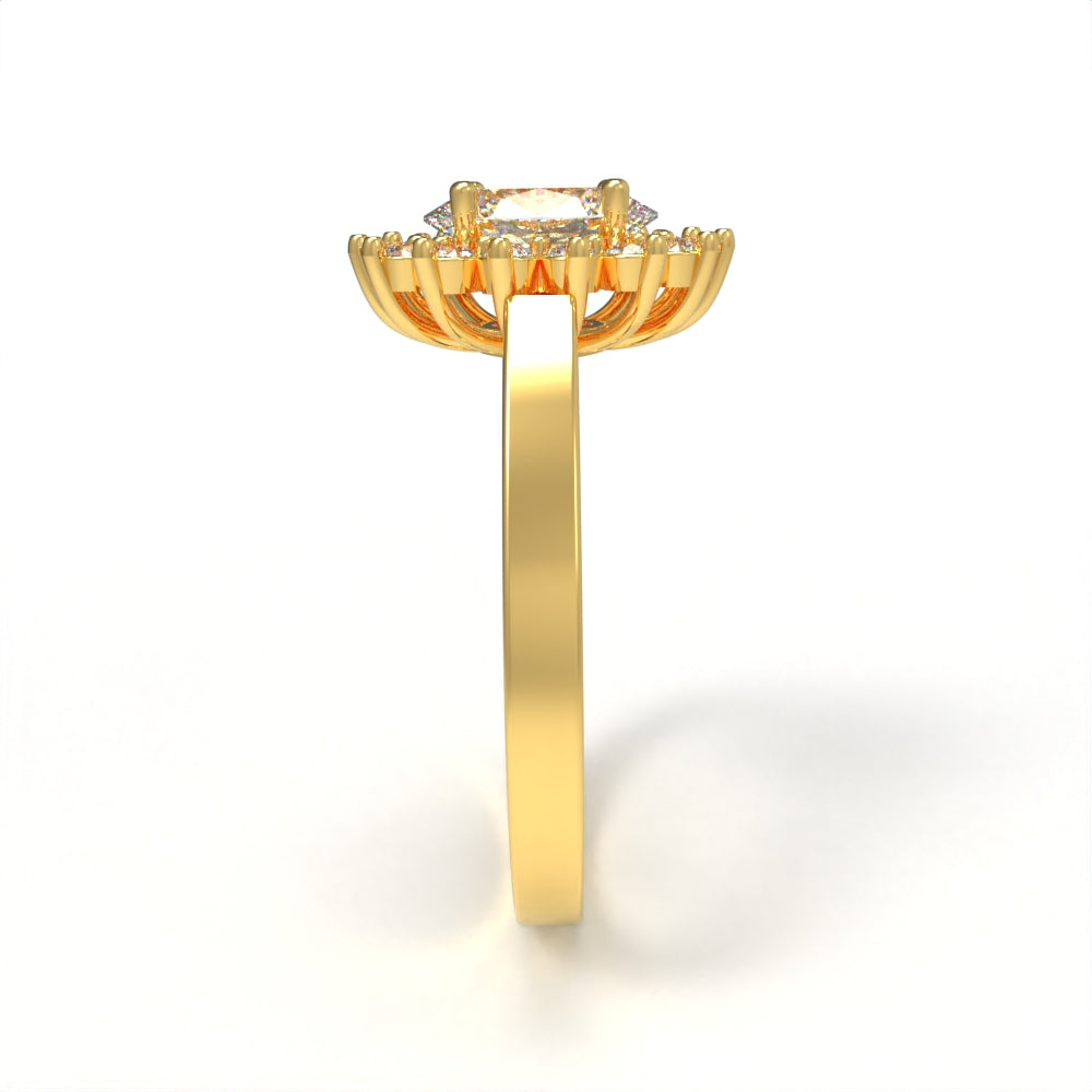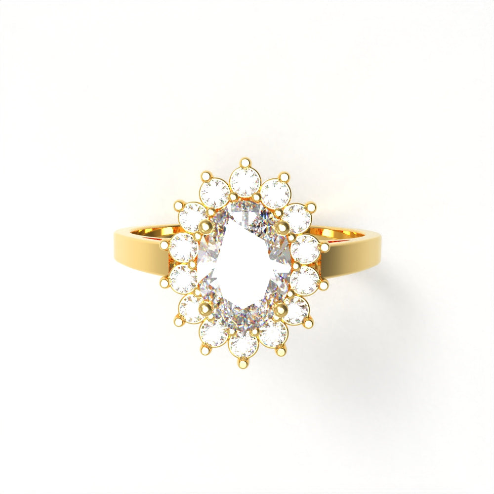 A glamorous halo engagement ring featuring a marquise-cut center stone surrounded by a radiant cluster of round diamonds. This vintage-inspired design, crafted in 14K or 18K gold, delivers bold sparkle and timeless elegance.